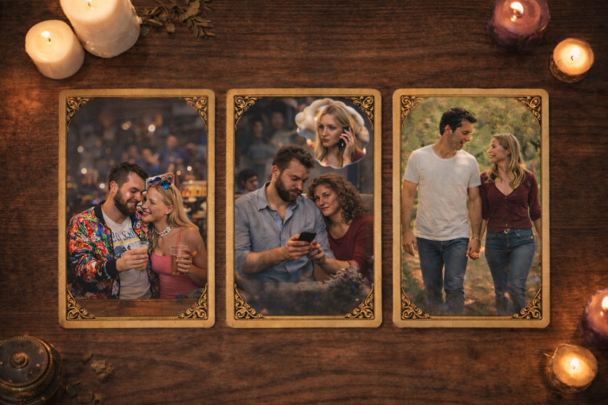 A three-card tarot spread showing different relationship scenarios, symbolising repeated seeking of answers, reassurance, and guidance through divination.